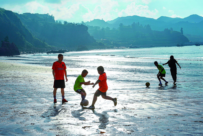 霞浦县下浒镇外浒沙滩上,“长风”足球队小球员们在海边踢球。新华社记者姜克红摄